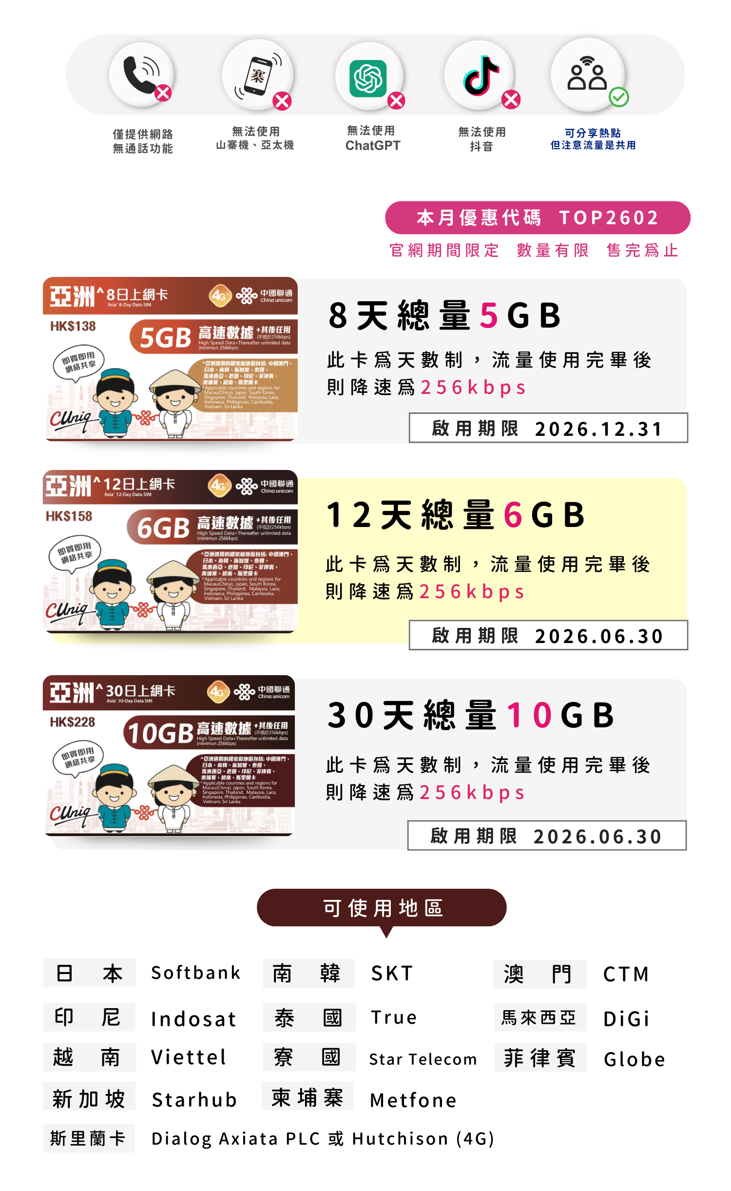 聯通亞洲多日上網卡30天10GB