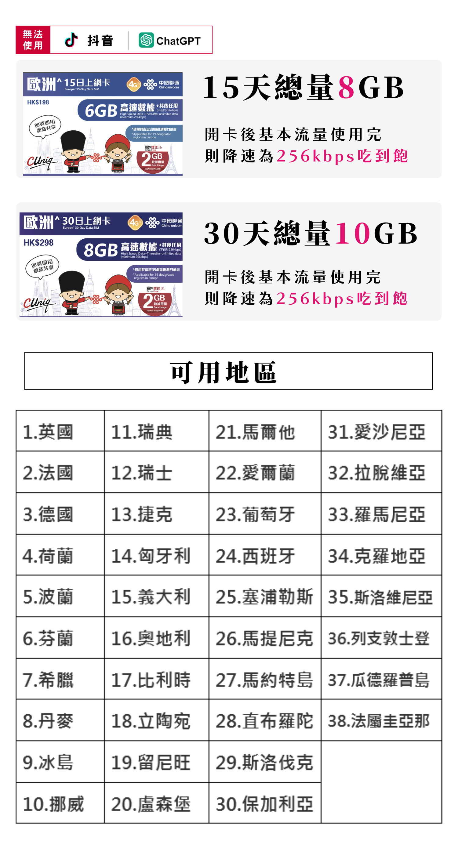 eSIM_聯通歐洲上網卡15天8GB