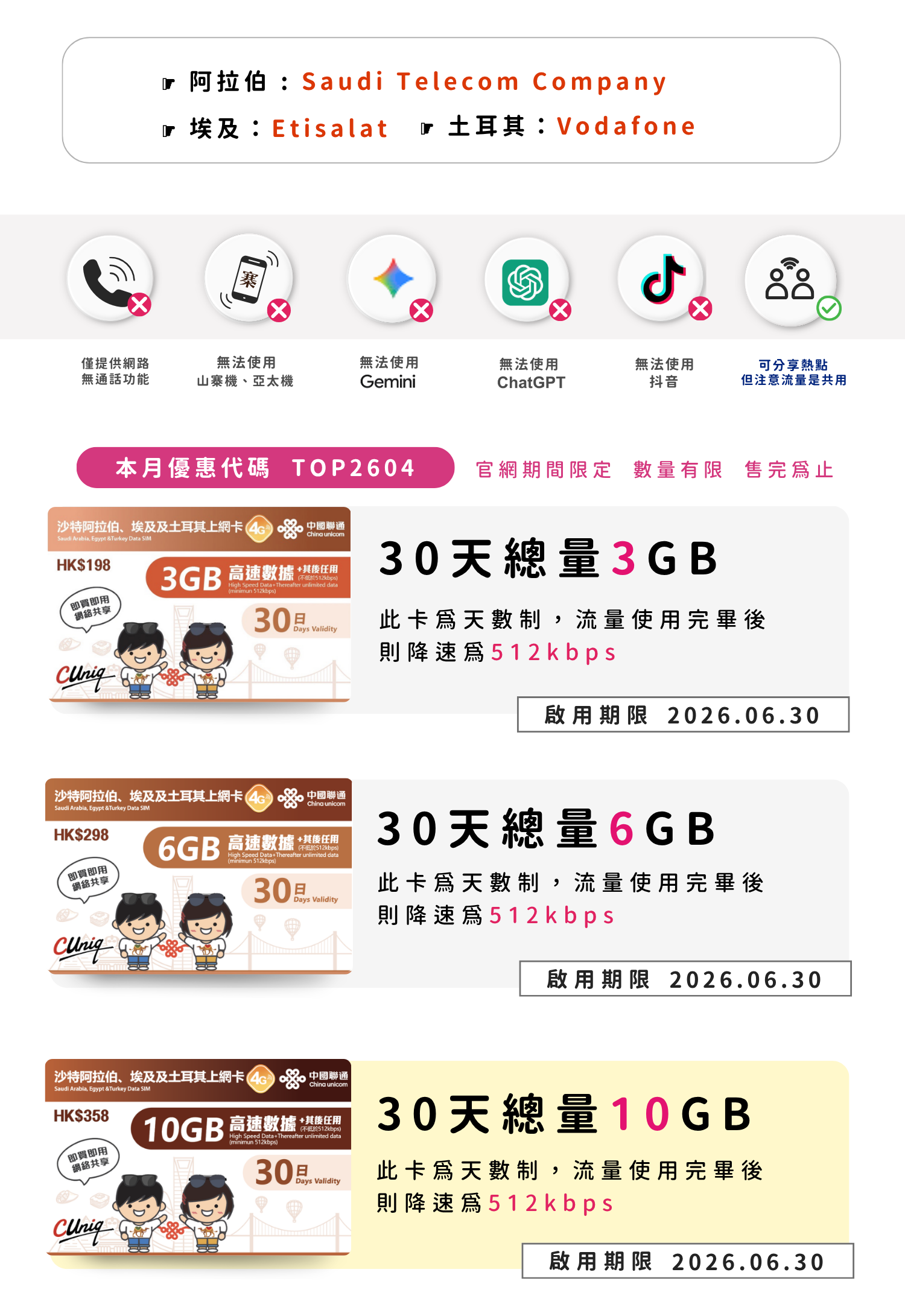 聯通沙特阿拉伯、埃及及土耳其上網卡