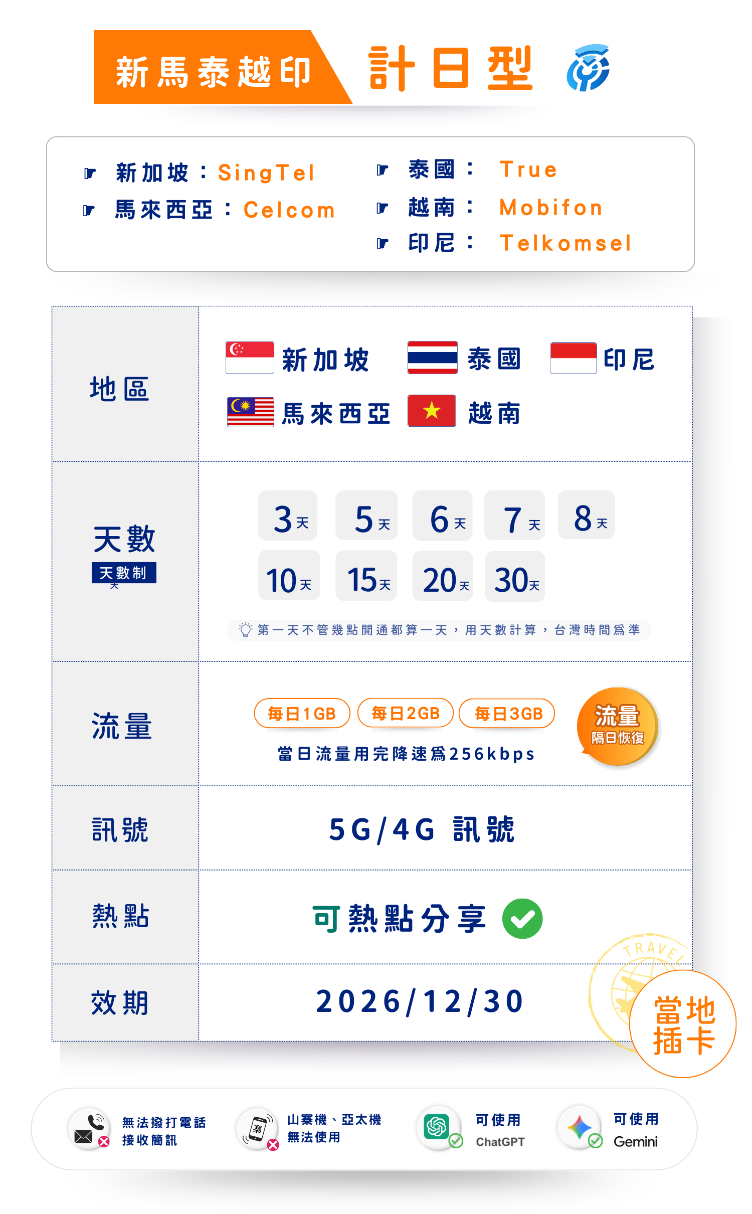 揚奇新馬泰越印(計日型)上網卡
