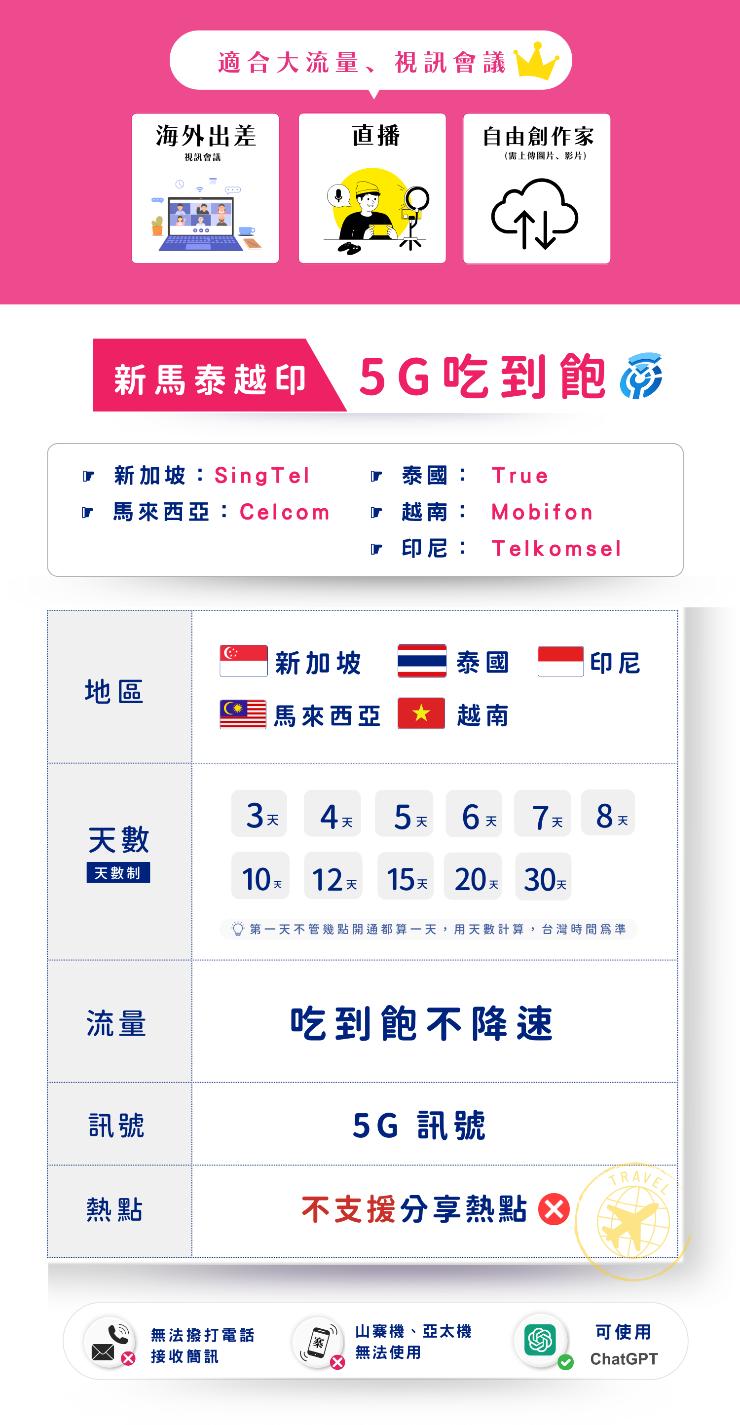 eSIM_揚奇新馬泰越印多日(5G吃到飽)上網卡