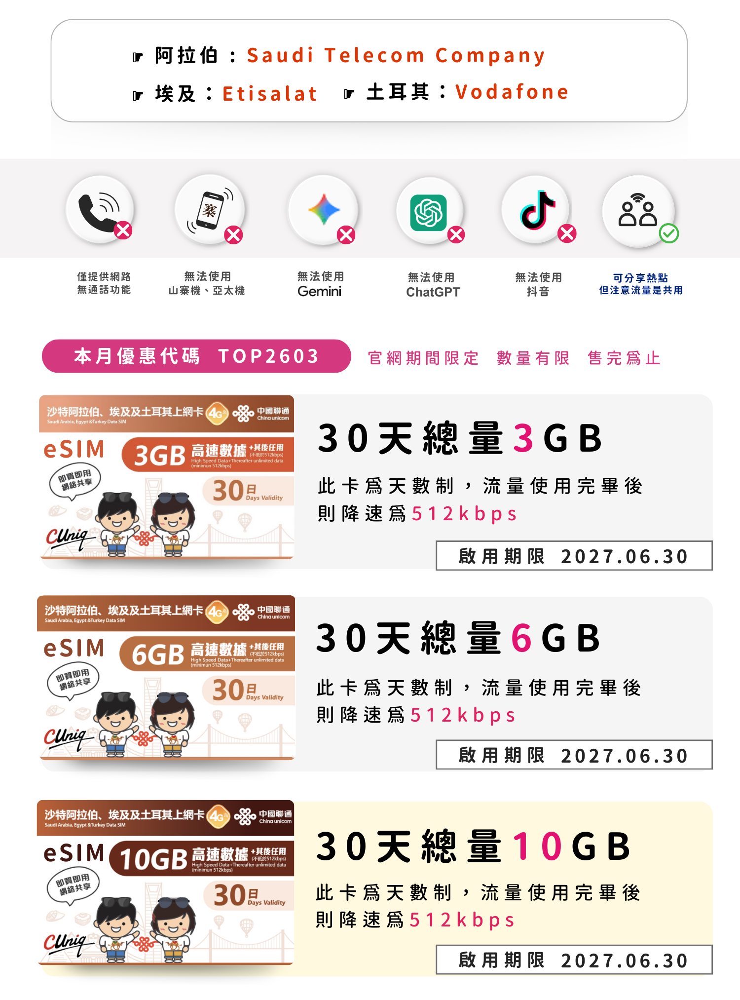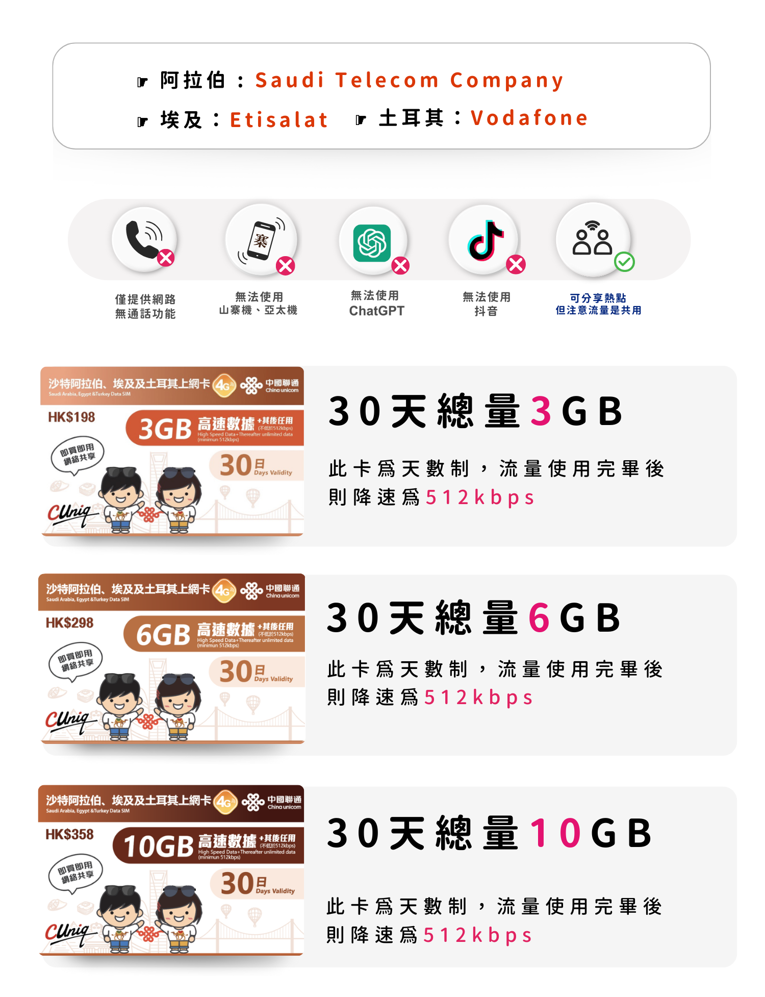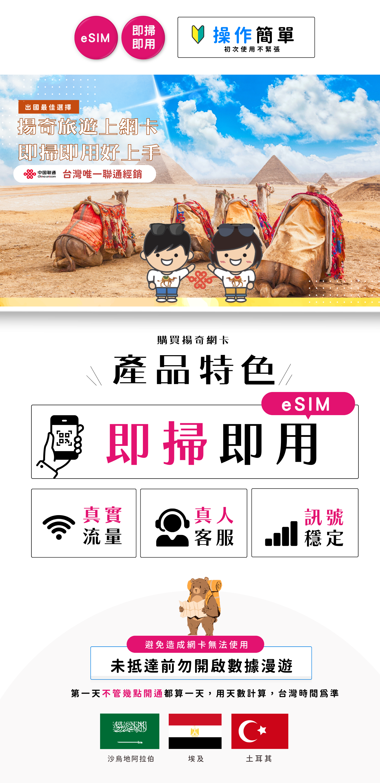 eSIM_聯通沙特阿拉伯、埃及及土耳其上網卡