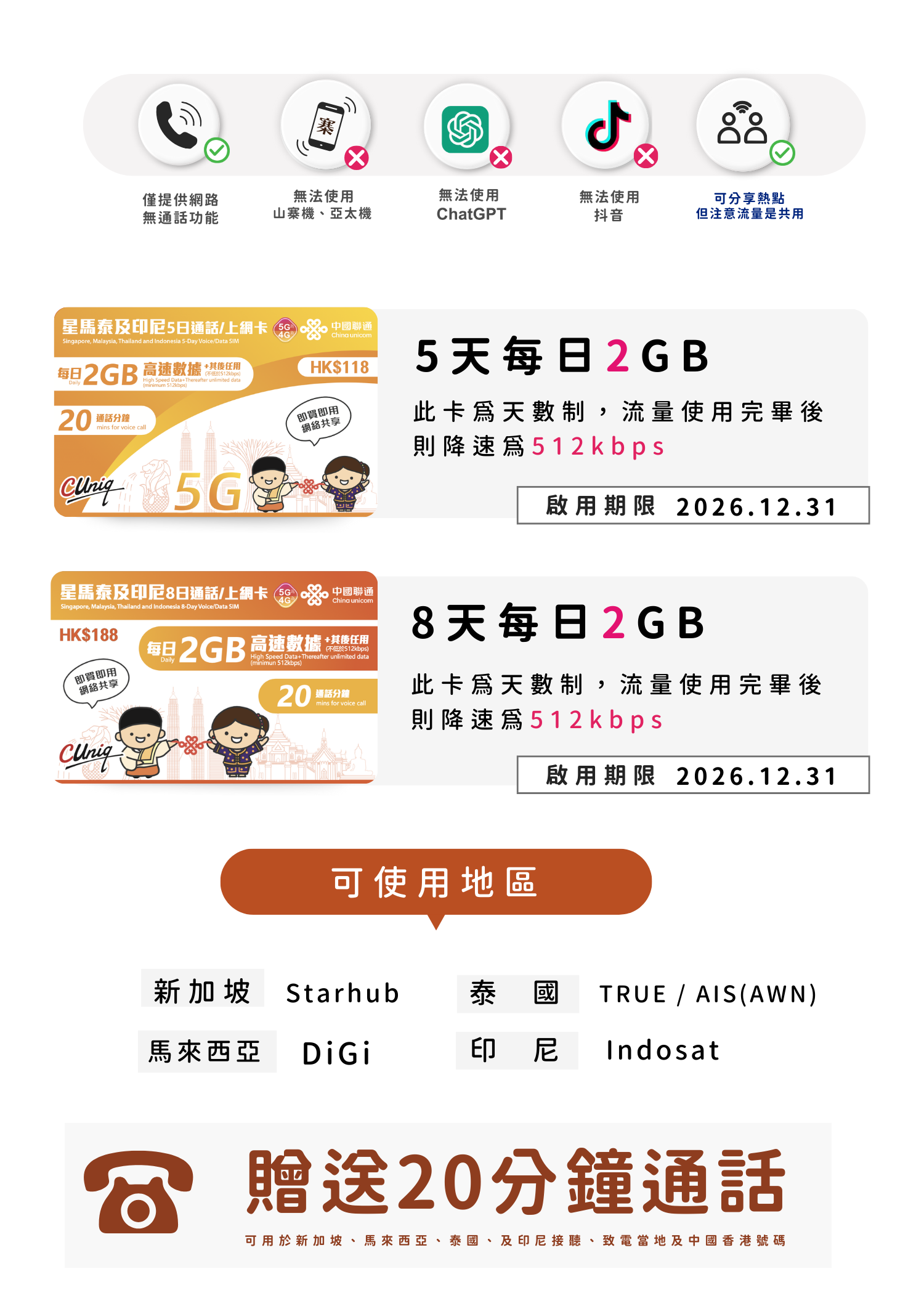 聯通星馬泰及印尼多日上網卡