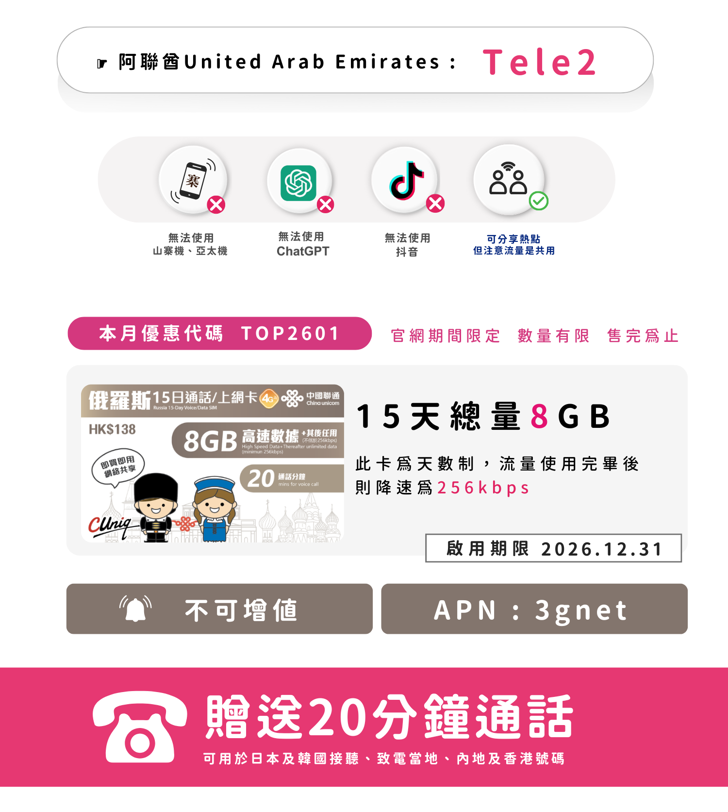聯通俄羅斯通話/上網卡15天8GB
